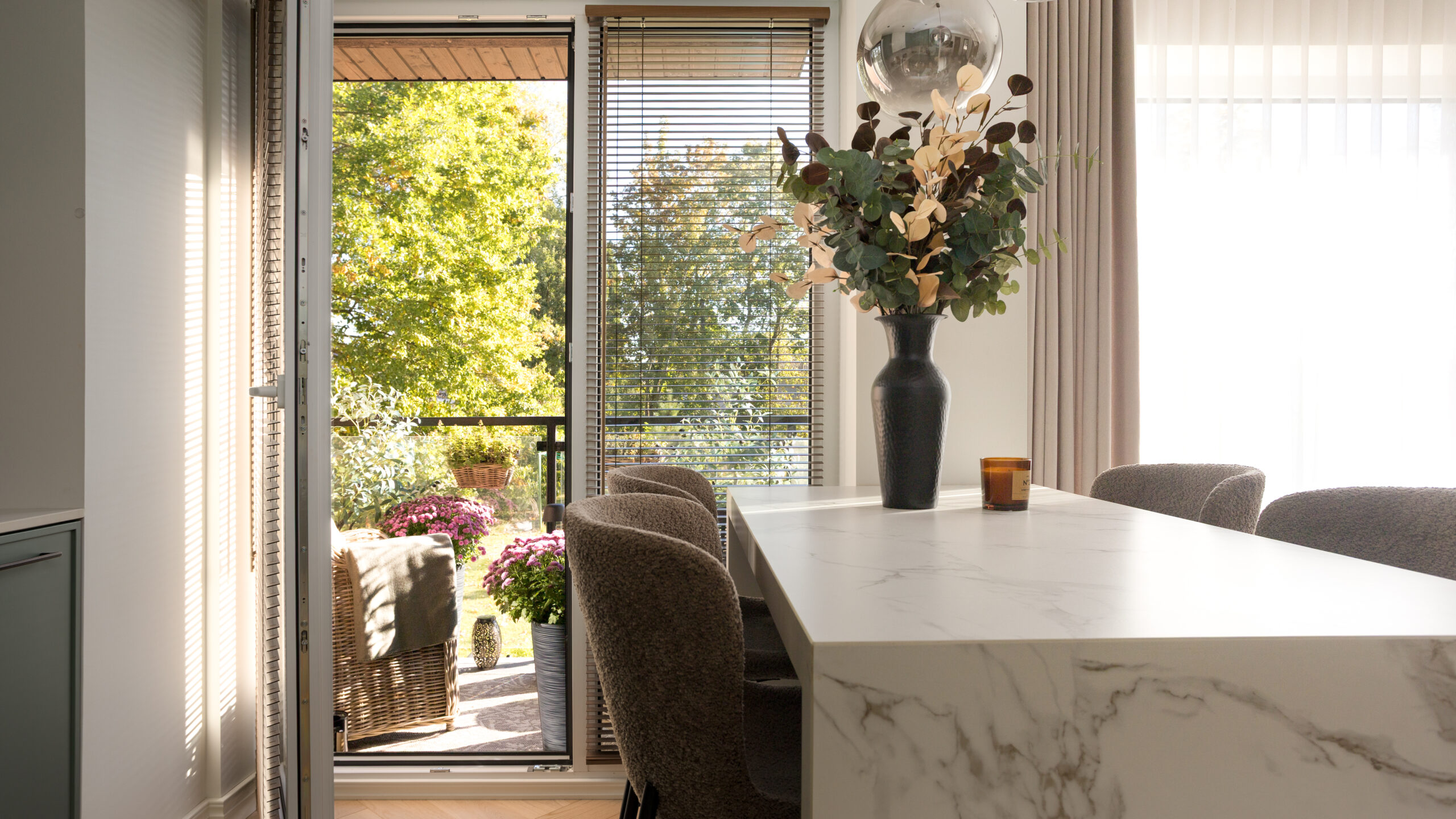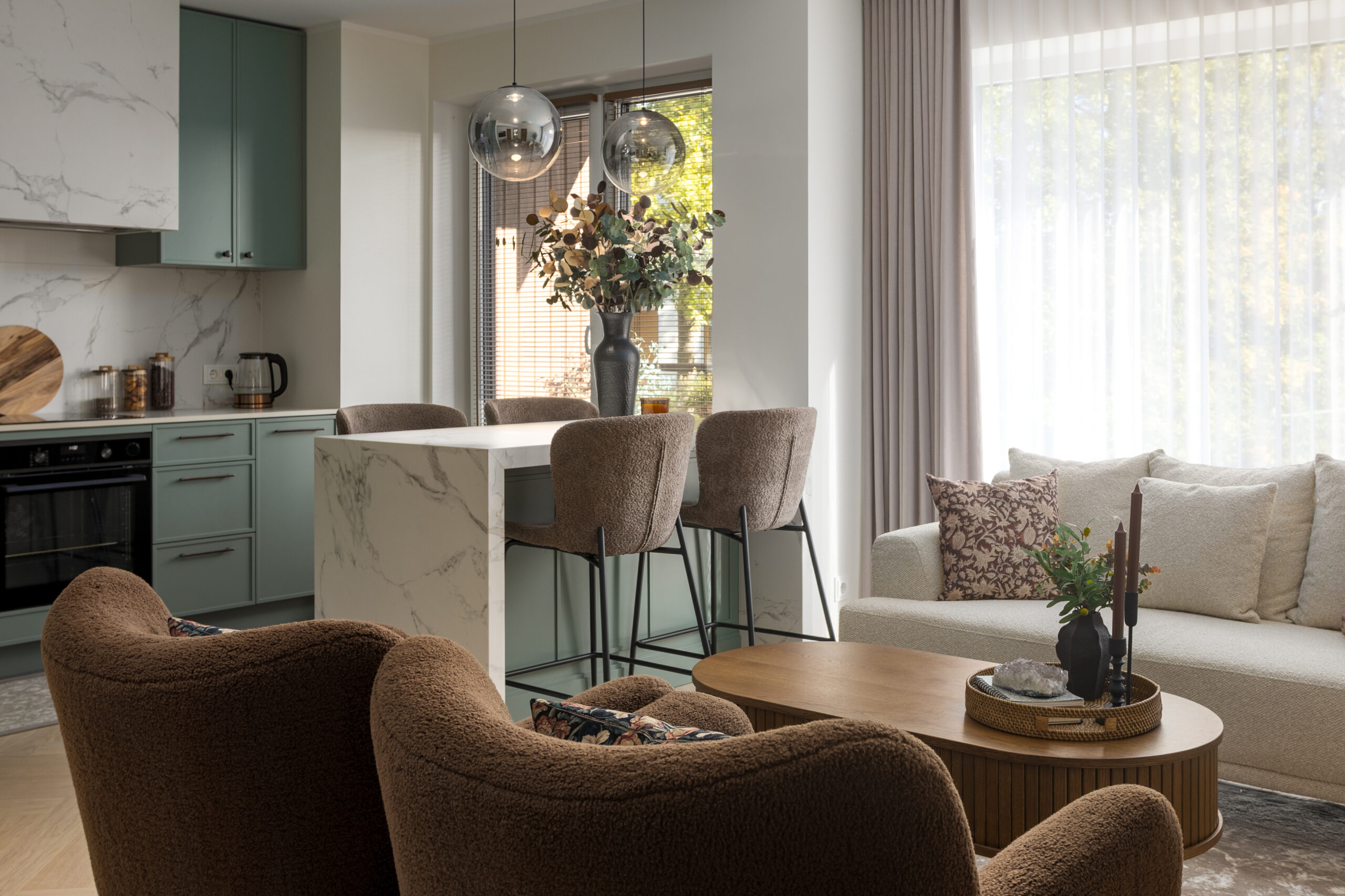 Köögisaar seob ruumi visuaalselt ja funktsionaalselt, pakkudes nii tööpinda kui ka loomulikku koosolemise kohta. Pehmed istmed ja tekstiilid lisavad interjöörile soojust ning kutsuvad ruumi kasutama igapäevaselt, mitte pelgalt imetlema. Detailid – metallaktsendid, klaasist valgustid ja hoolikalt valitud aksessuaarid – on