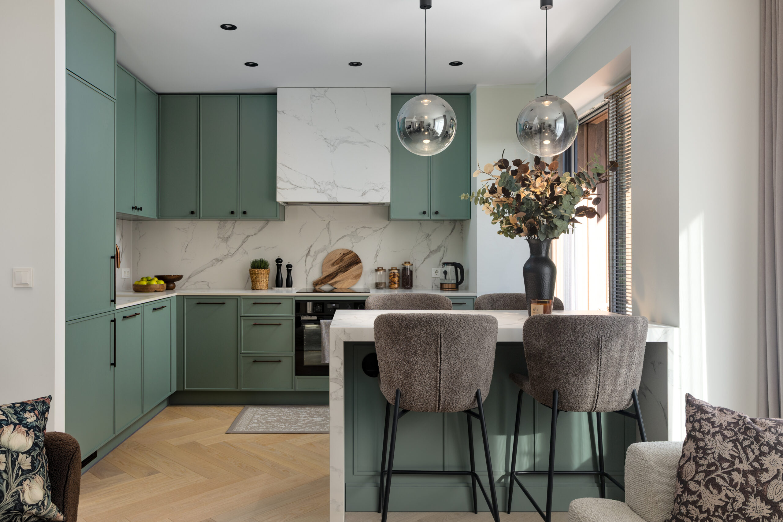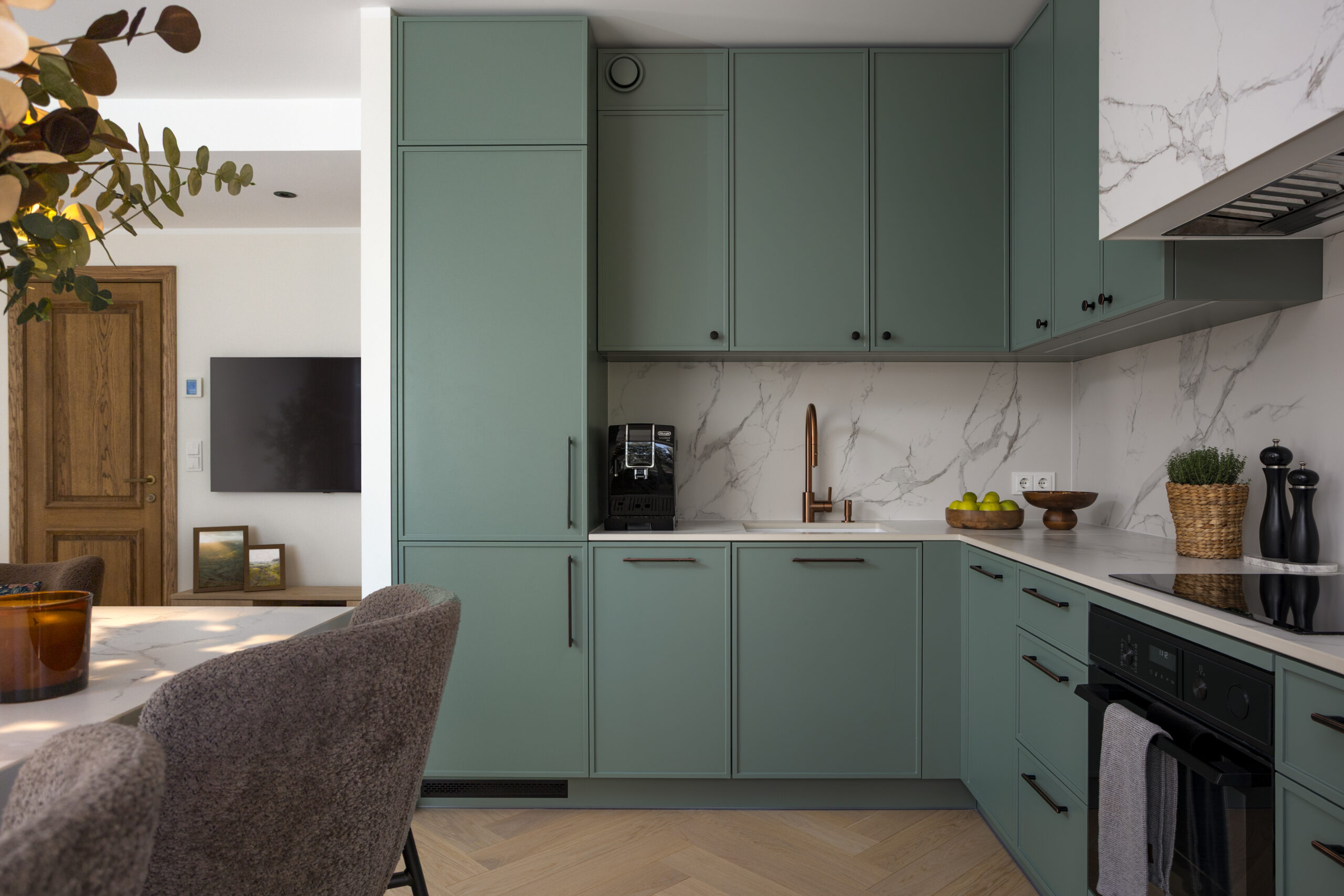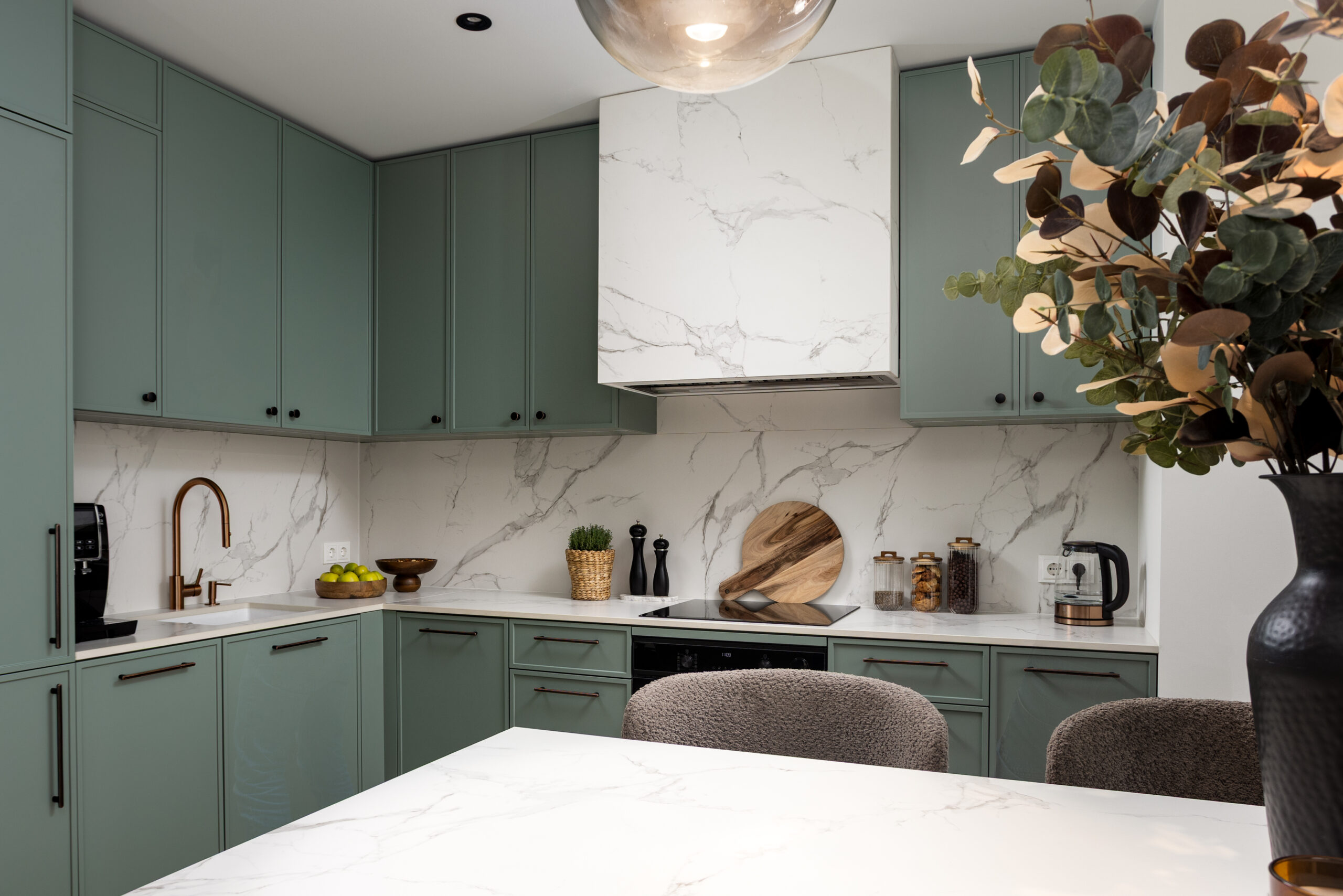 Köök on kujundatud rahulikuks ja ajatuks tervikuks, kus moodne klassika väljendub tasakaalus vormides, läbimõeldud funktsioonides ja vaoshoitud materjalivalikus. Salveirohelised kapid loovad pehme, looduslähedase tausta, mida tasakaalustavad heledad marmormustriga nii töötasapind kui ka tagasein.