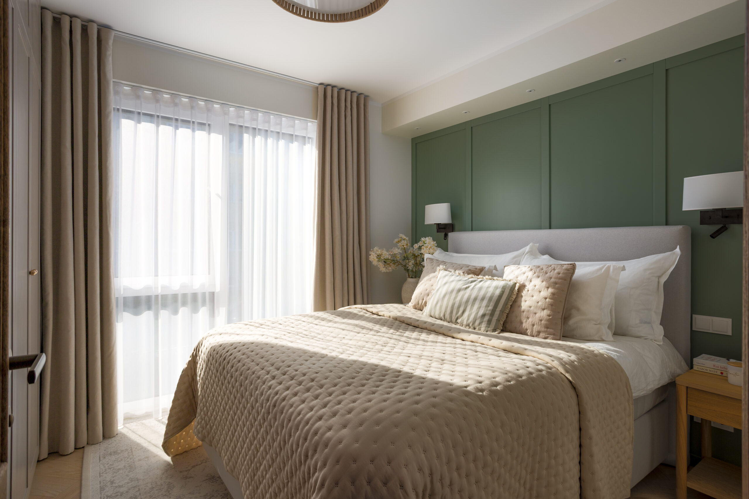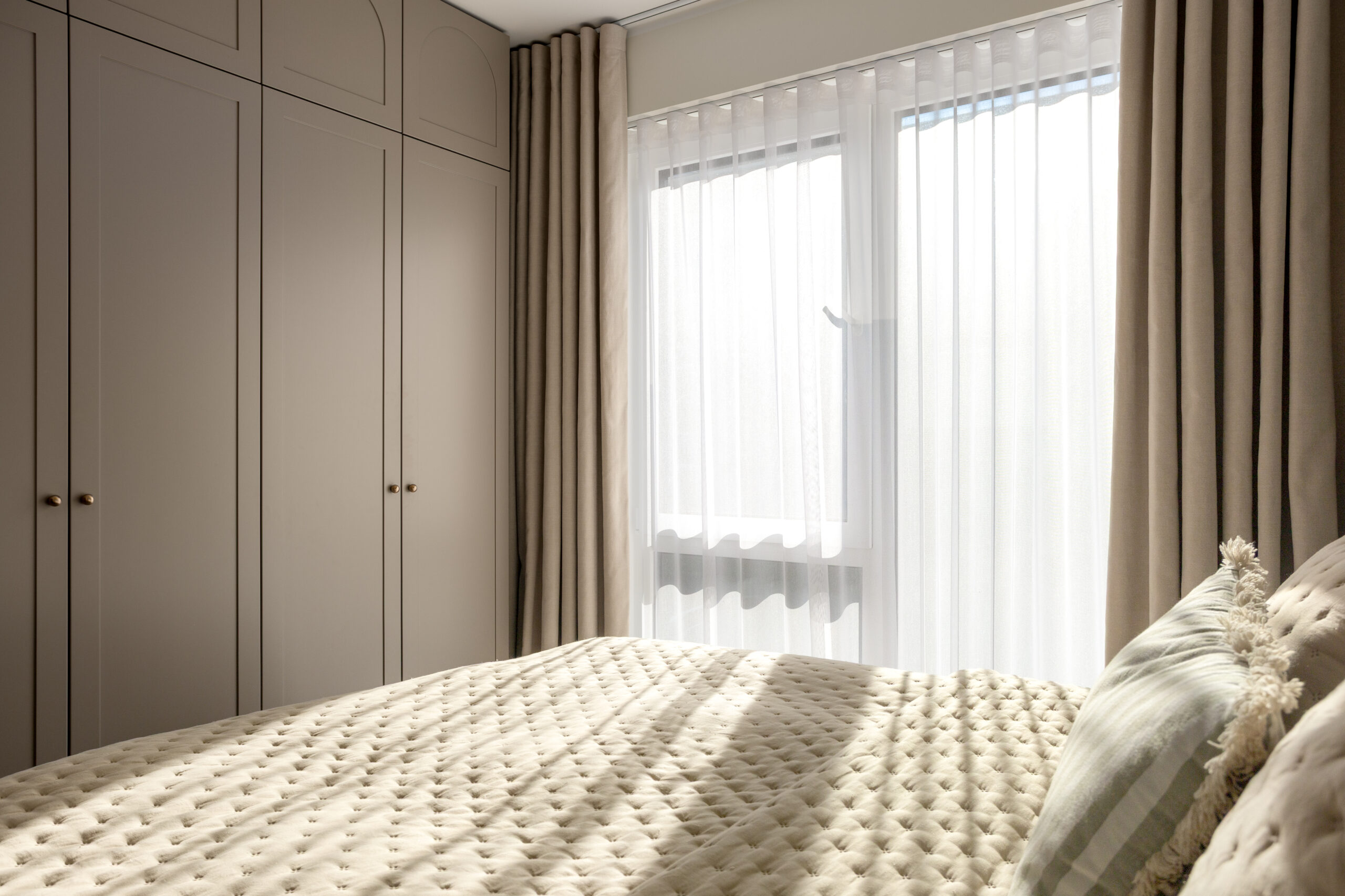 Magamistuba on kujundatud vaikseks ja tasakaalukaks keskkonnaks, kus pehmed toonid ja kihilised tekstiilid toetavad puhkust ja taastumist. Voodi päiseseina puitpaneelsein lisab ruumile soojust ja struktuuri, tuues interjööri loomuliku materjalikihi ning sidudes ruumi tervikuks. Maast laeni ulatuv garderoobikapp eristub uste kaarjate vormidega, mida katsetati mööblitootjaga spetsiaalselt selle projekti jaoks. Hajus valgus ja rahulikud pinnad rõhutavad materjalide tekstuuri ning loovad ajatu, väärika ja pehme atmosfääri.