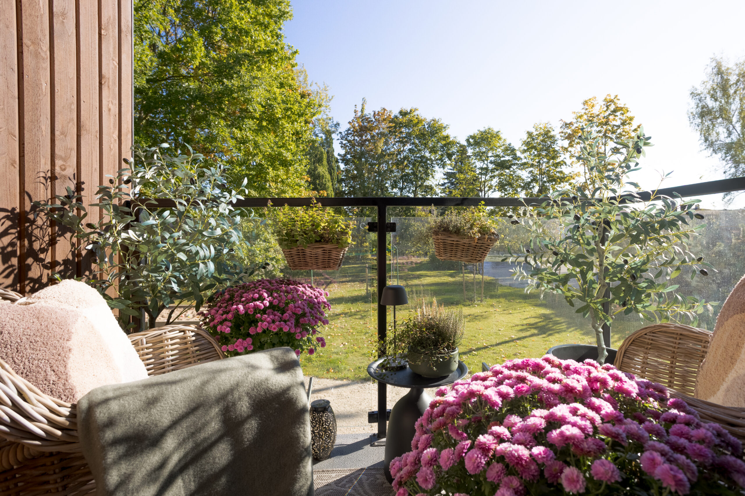 Rõdu avaneb otse köögist ja on soojadel aastaaegadel aktiivses igapäevases kasutuses. See toimib loomuliku jätkuna interjöörile, pakkudes võimalust liikuda sujuvalt sise- ja väliruumi vahel. Mugav istumisala, rohelus ja hoolikalt valitud taimed loovad rahuliku keskkonna hommikukohviks, lõõgastumiseks või vaikseteks õhtusteks hetkedeks. Klaaspiire hoiab vaate avarana ning laseb ümbritseval loodusel jääda ruumi lahutamatuks osaks. See on läbimõeldud väliruum, mis toetab kodu igapäevast rütmi ja hooajalist eluviisi.