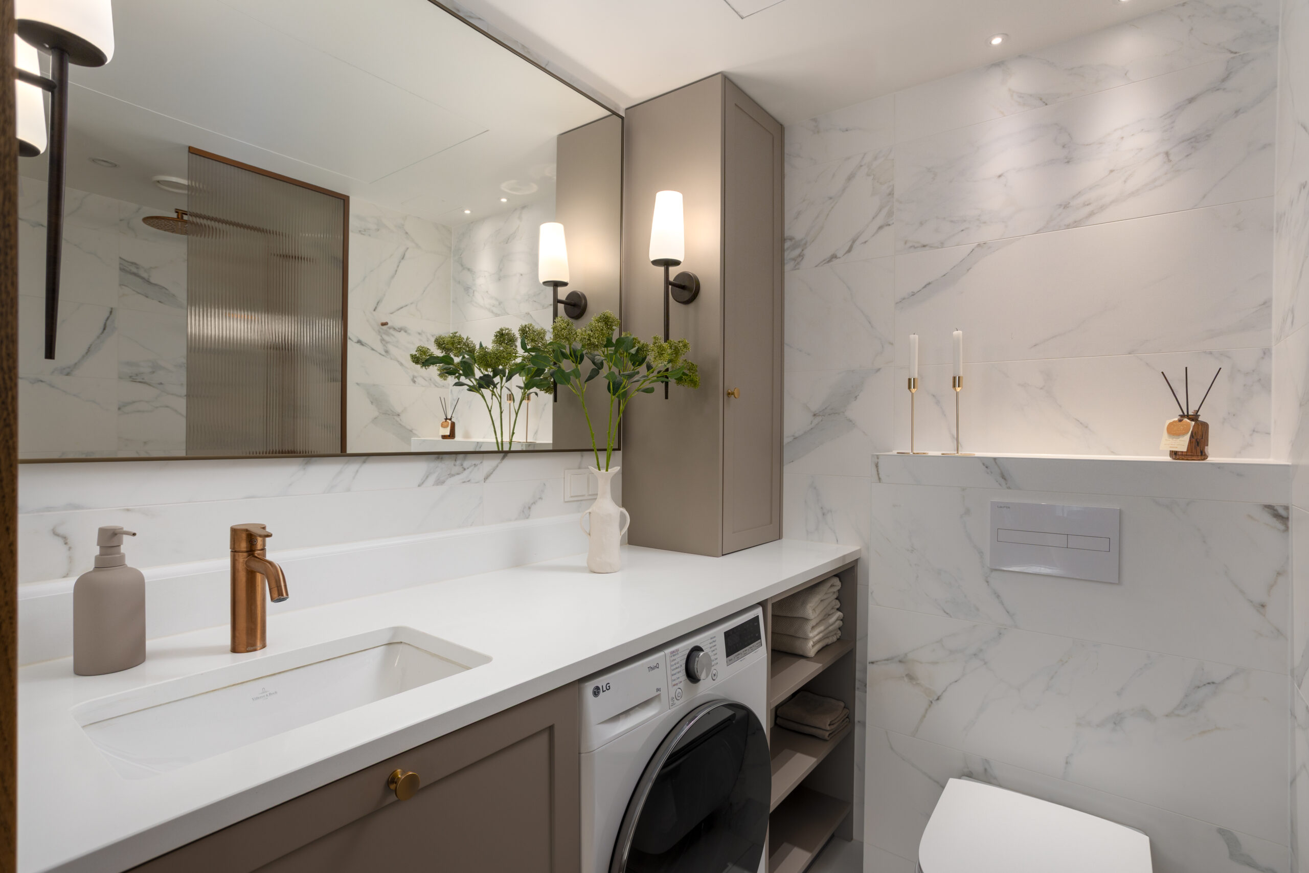 Vannituba on kujundatud rahuliku ja selge ruumina, kus praktilised lahendused sulanduvad esteetikasse. Heledatel pindadel kulgev pehme marmorimuster loob klassikalise ja ajatu tausta, lisades ruumile sügavust ja väärikust. Pikk tasapind pakub piisavalt ruumi igapäevaseks kasutuseks, samas jääb üldmulje puhas ja korrastatud. Integreeritud pesumasin ja avatud riiulid on diskreetselt mööbli sisse peidetud. Pronkstoonis metallid, mis korduvad kogu korteri kujunduses, lisavad ruumile soojust ja seovad vannitoa visuaalselt ülejäänud koduga. Pehme valgustus ja suur peegel rõhutavad proportsioone ning loovad hoolitsetud ja rahuliku atmosfääri.