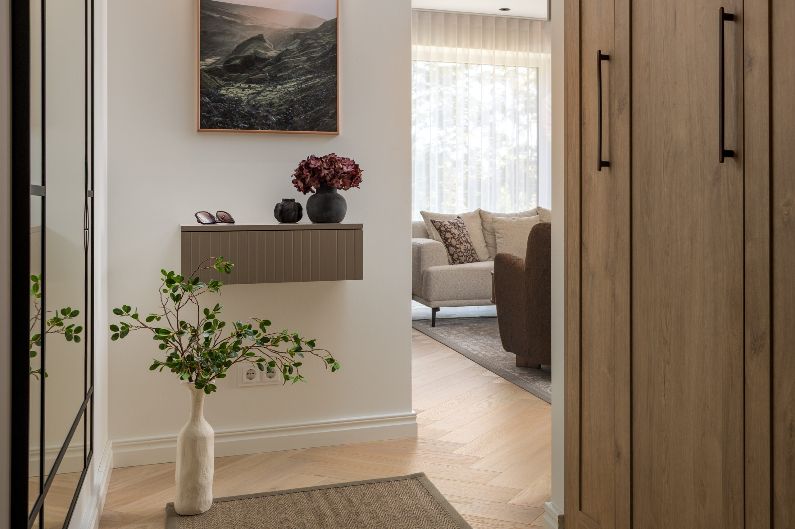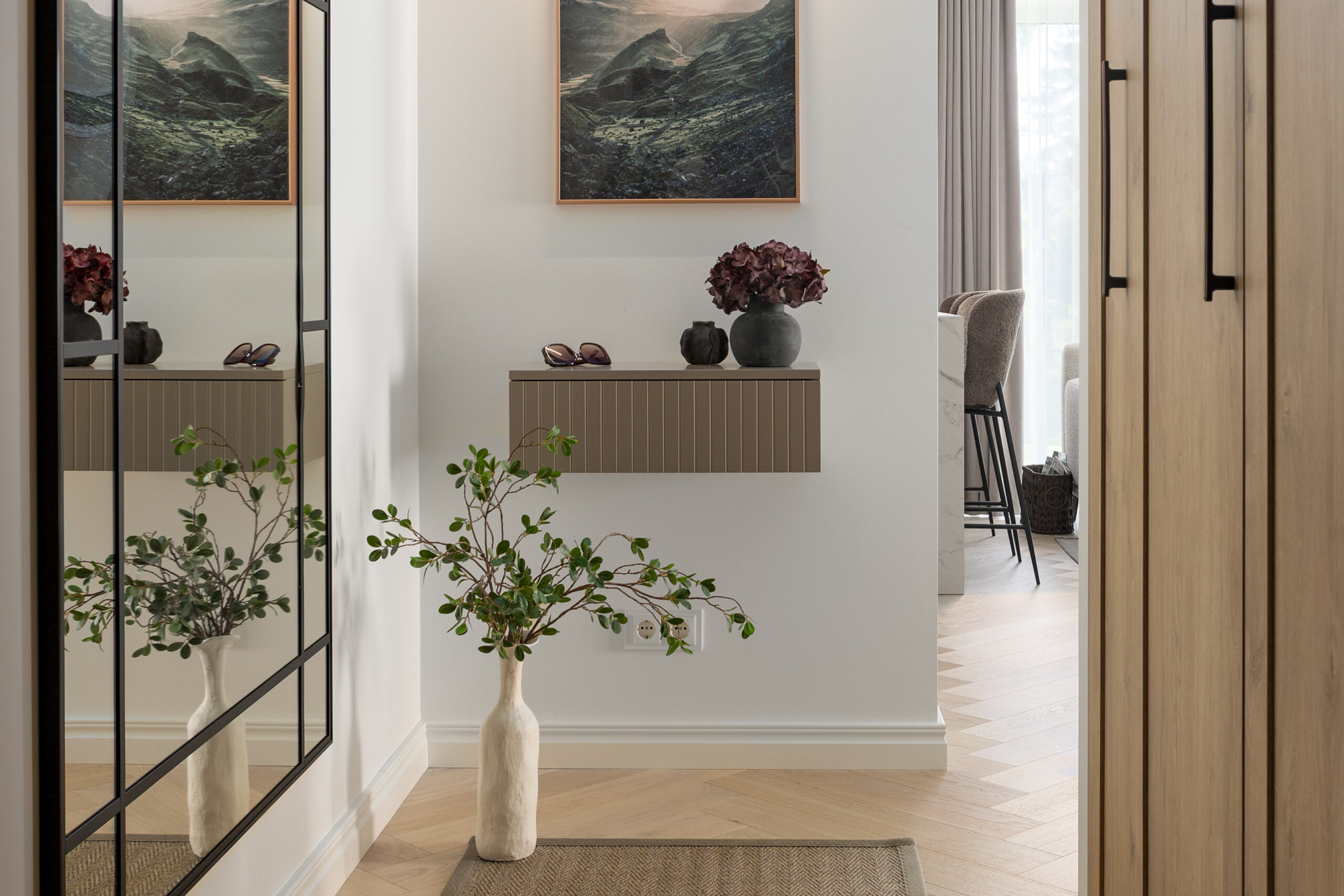 Esik on kujundatud selge ja tasakaalustatud ruumina, mis loob esimesest sammust alates rahuliku ja korrastatud tunde. Maast laeni ulatuv puitviimistlusega garderoob pakub rohkelt panipaiku ning lisab ruumile soojust ja vertikaalset rütmi. Suur peegel avardab vaadet ja peegeldab loomulikku valgust sügavamale interjööri. Seinale kinnitatud konsool ja hoolikalt valitud detailid loovad funktsionaalse, kuid vaoshoitud terviku. Esik seob ülejäänud kodu üheks sujuvaks ja ajatu ilmega ruumiks.